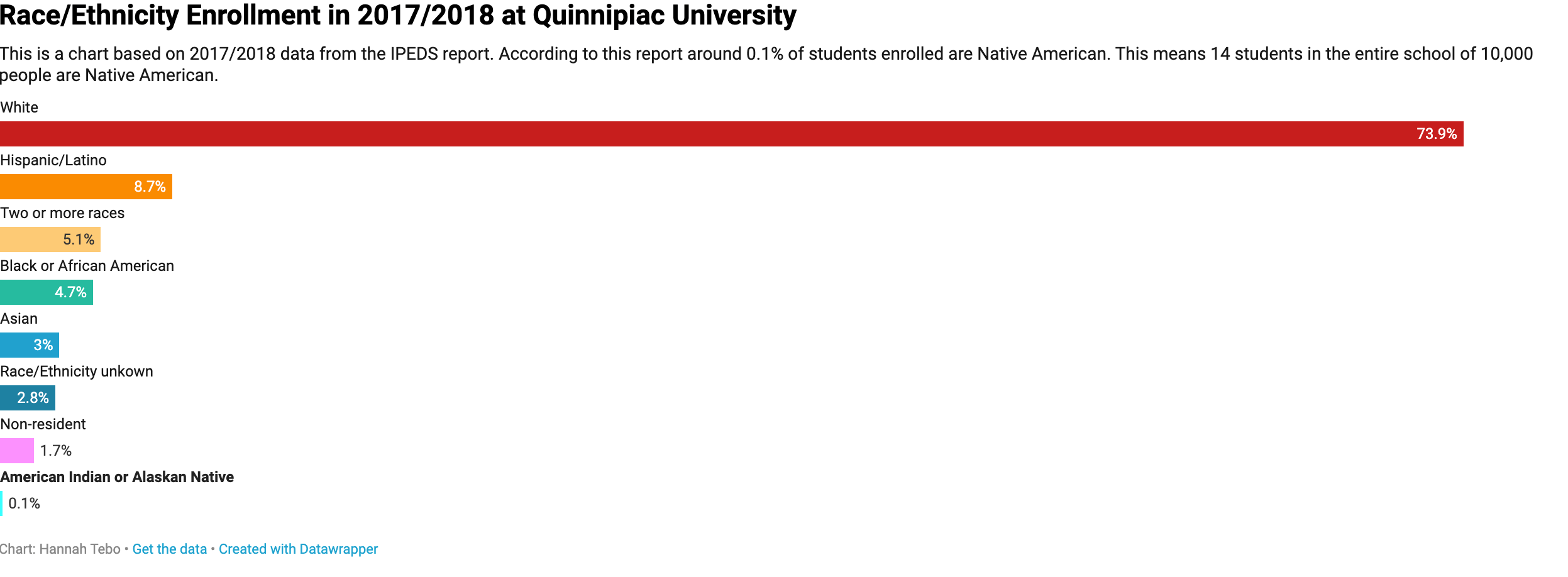 Quinnipiac University, with a 73 percent white student demographic, has a low enrollment of Native American students and other minority groups despite its indigenous name. According to the 2016 IPEDS Data Feedback Report, 0.1 percent of students enrolled in the university identified as Native American.This number translates to 14 Native American students enrolled in a university of about 10,000 students.